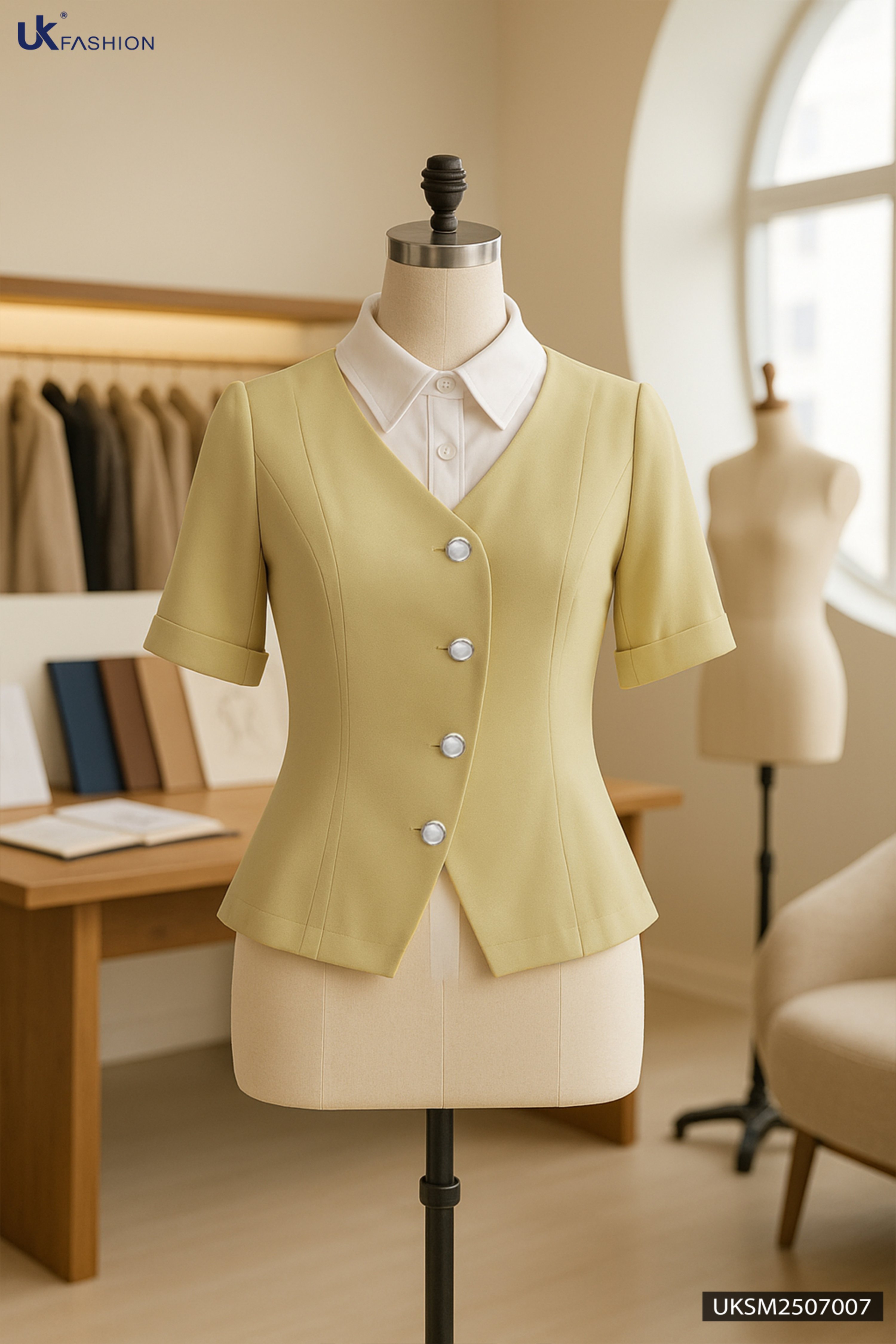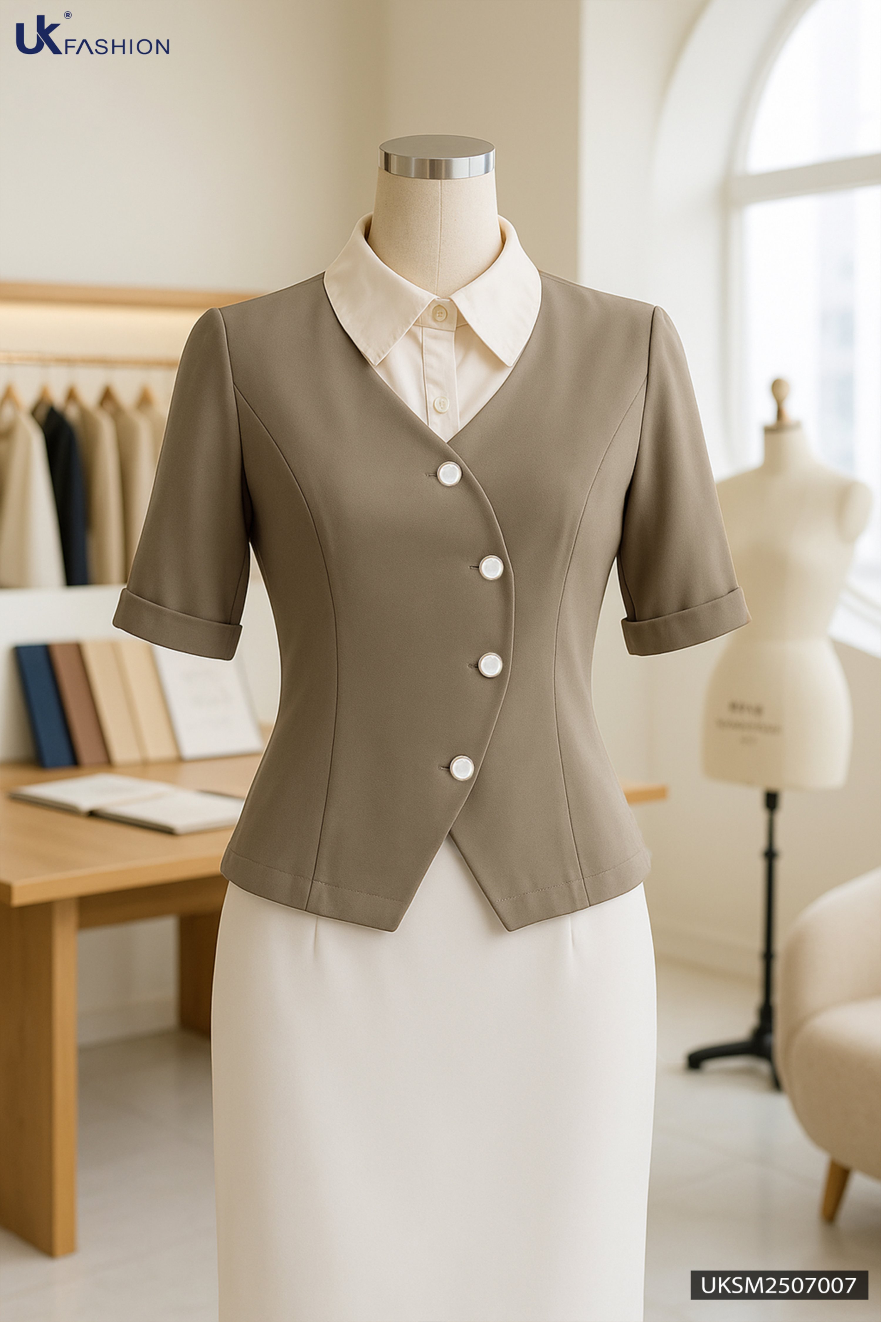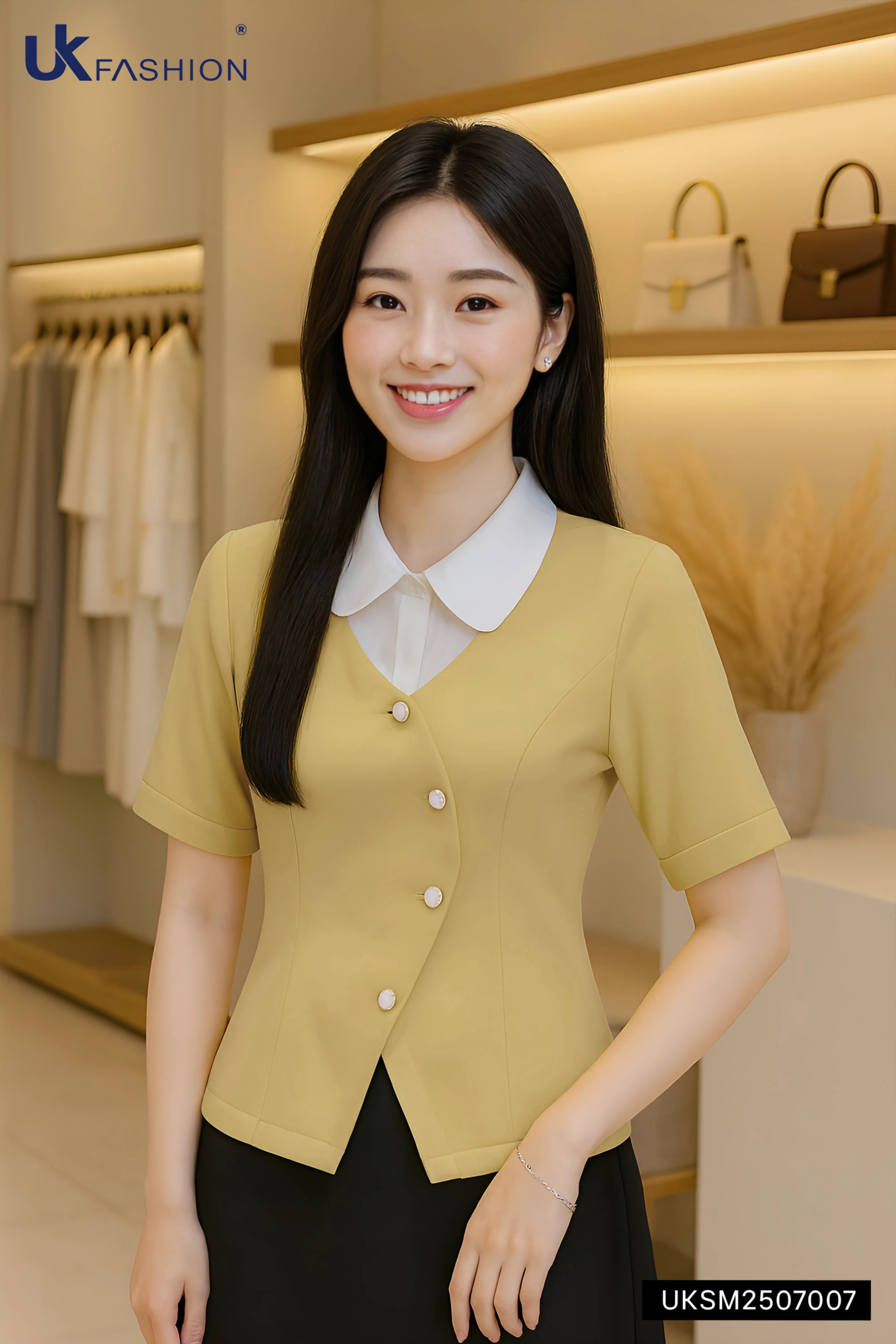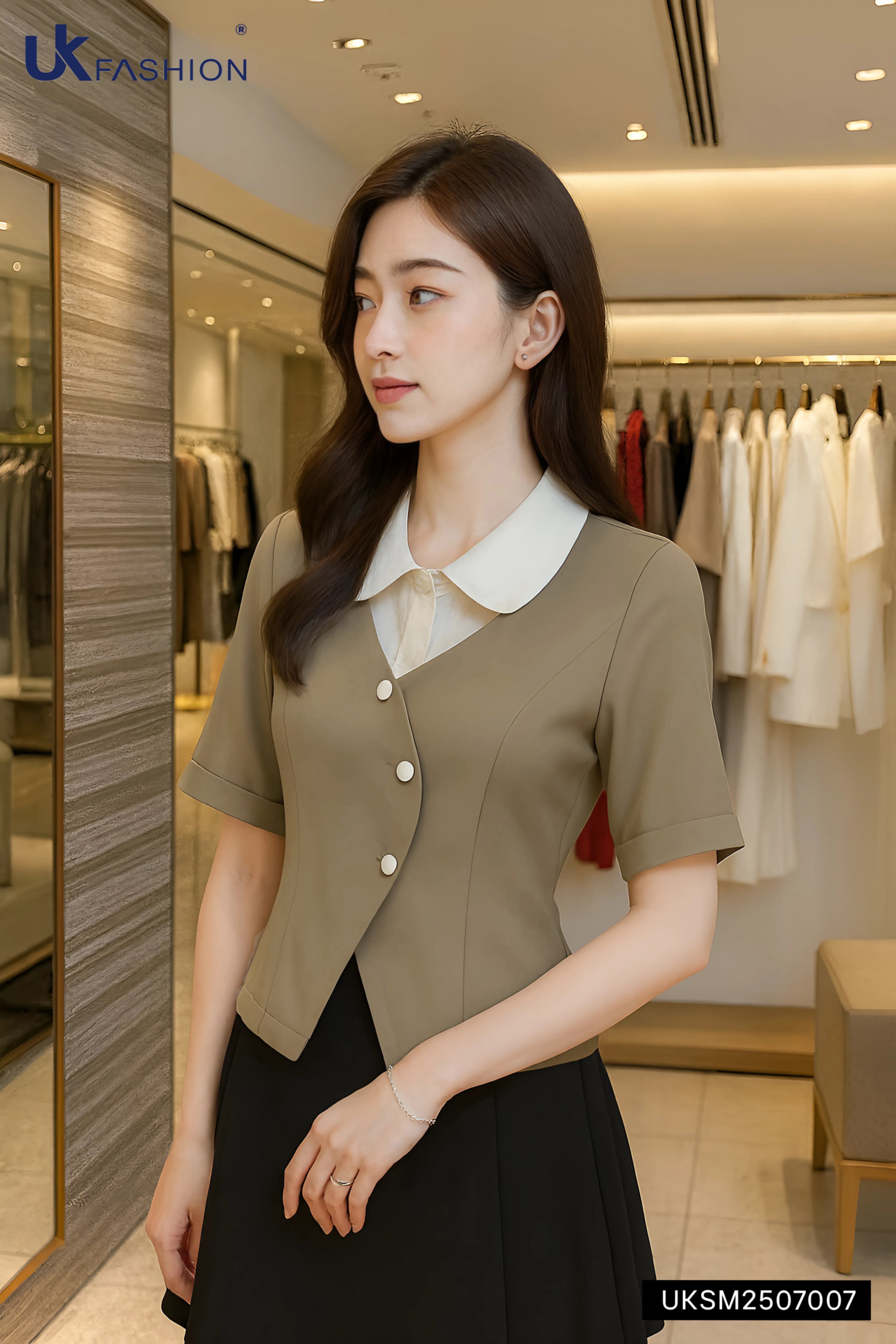 Sơ mi phối cổ sen vạt lượn kiểu cách mới UKSM2507007 KHUYẾN MÃI - ƯU ĐÃI